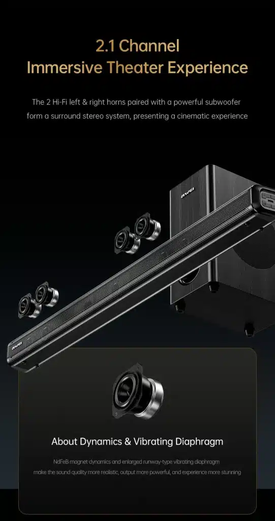 2.1 Channel Audio System: Includes two stereo channels (left and right) and a subwoofer for enhanced bass response.