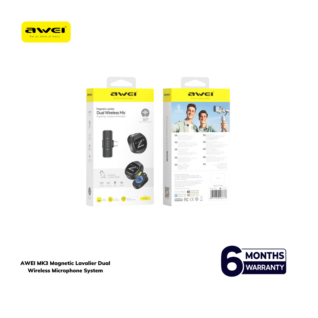 Capture crystal-clear audio anywhere, without wires. The AWEI MK3 Magnetic Lavalier Dual Wireless Microphone System is designed for creators, streamers, presenters, and professionals who demand flawless, portable audio. Featuring a strong magnetic clip for secure, invisible placement, a robust 25-meter transmission range, and true plug-and-play convenience, this compact kit delivers studio-quality sound on the go. As always, Top Tech Zone provides only 100% authentic products backed by an official warranty.