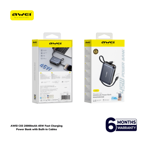 The Awei C03 offers 20000 mAh capacity, 45 W fast charging, and built-in cables for convenient, cable-free charging. It’s ideal for on-the-go power backup, travel, daily use, and emergencies, providing stable performance, broad device compatibility, and easy portability.