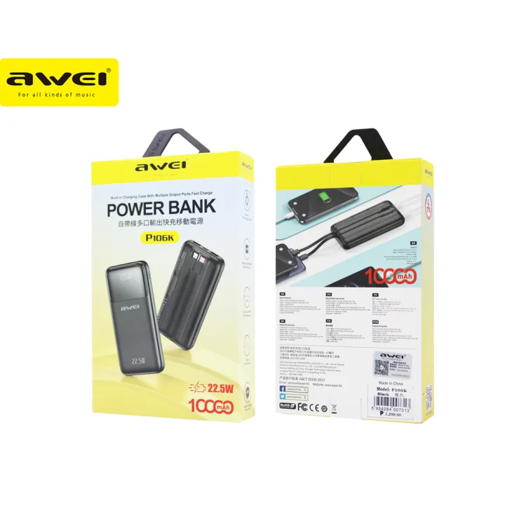 In conclusion, the Awei P106K 10000mAh 22.5w Multi Output Fast Charging Powerbank offers convenience, efficiency, and peace of mind in a compact package. With its versatile charging options and stylish design, it’s the ideal solution for staying powered up wherever life takes you.