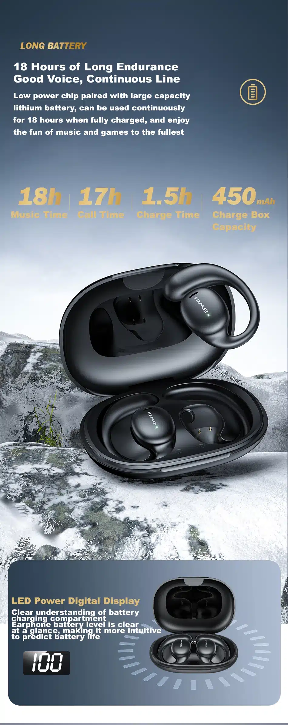 Listen to quality sound even while working out with the Awei TWS T80 Air Conduction Earbuds. Comes with a sporty design that gives you ergonomic ear-loop design for ensuring maximum comfort during wearing. There’s a 10mm dynamic driver for providing greater listening experience during your live calls and while playing your favorite music. Has a HiFi sound system and a 25° sonic ray design for improving sound quality. Latest Bluetooth 5.3 functionality along with 10 meter of transmission distance gives you stable connectivity. 450mAh of bigger battery with the case that provides longer power for enjoying your songs during next adventures. Charge the case smoothly with the dedicated type-C port and get around upto 18 hours of play time. Get an overview of the recent battery left of the case with the smart digital display between the case. Lightweight build quality with just 105 grams lets you carry the T80 earbuds always & anywhere you go.