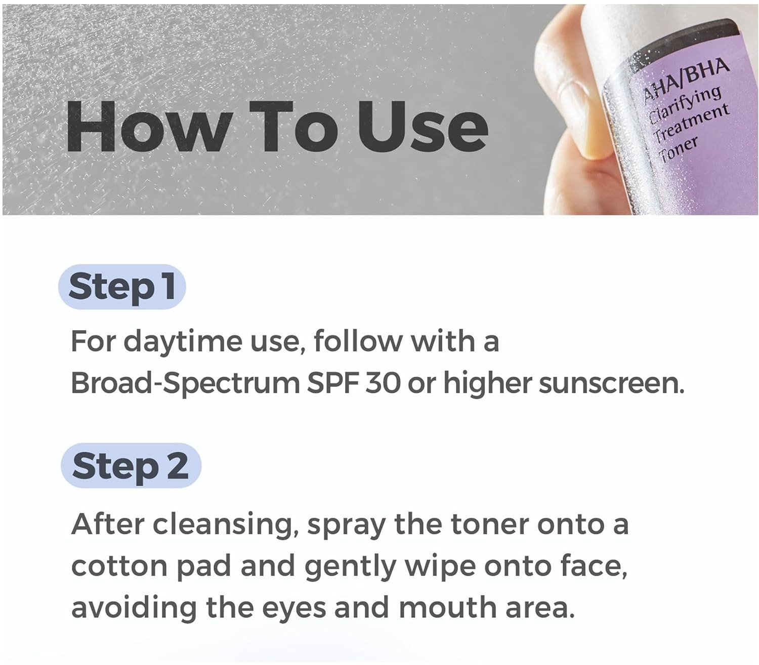 After cleansing, spray the toner onto a cotton pad and gently wipe onto face, avoiding the eye and mouth area. For use during the daytime, follow with a broad-spectrum sunscreen rated SPF 30 or greater.