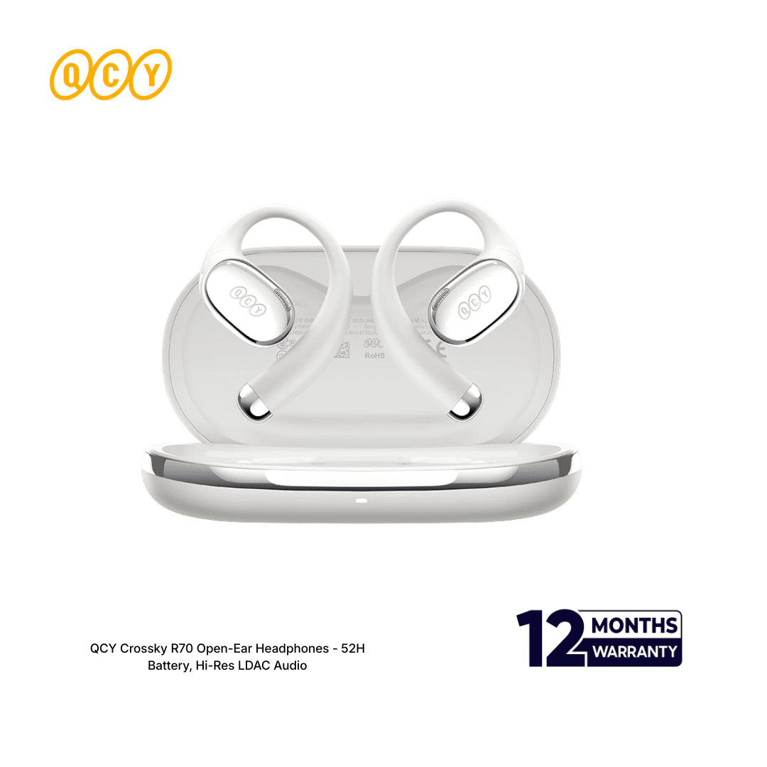 Redefine open-ear audio with studio-grade clarity. The QCY Crossky R70 Open-Ear Wireless Headphones combine an extraordinary 52-hour battery life with certified Hi-Res Audio via LDAC technology for an immersive, detailed listening experience. Featuring a powerful 17×12mm triple-magnet driver, a built-in white noise playlist for focus, and a ultra-comfortable secure-fit design, these headphones are engineered for all-day comfort and premium performance. With IPX5 waterproofing and full app personalization, they’re perfect for work, travel, workouts, and relaxation. Top Tech Zone guarantees 100% authentic products backed by an official warranty.